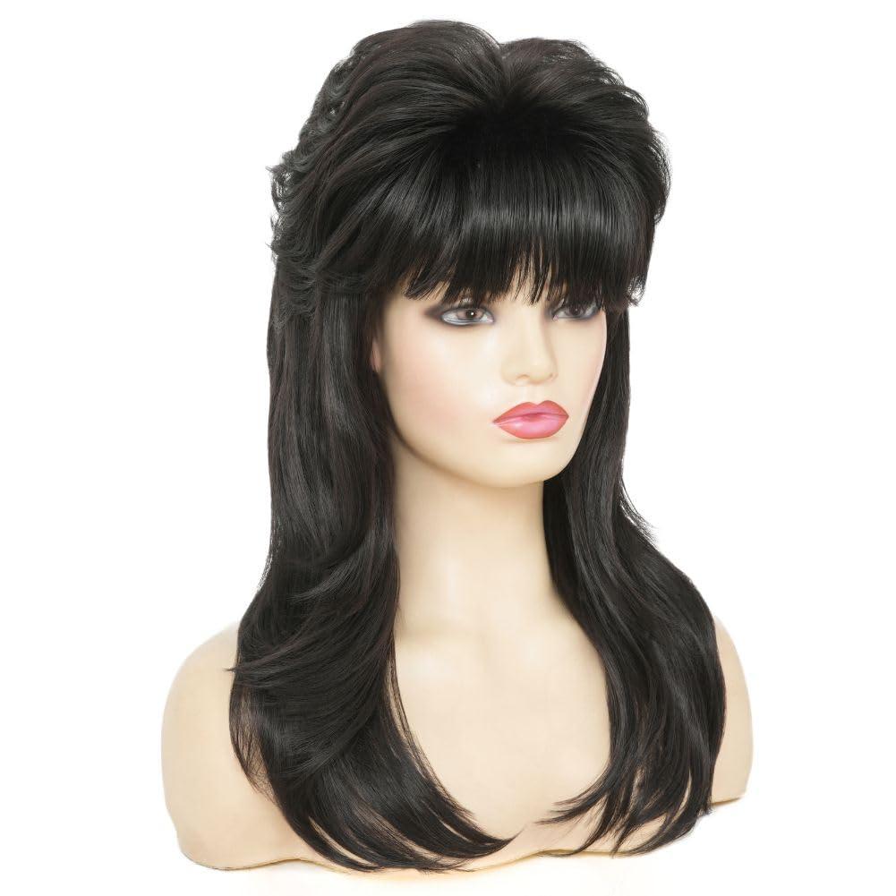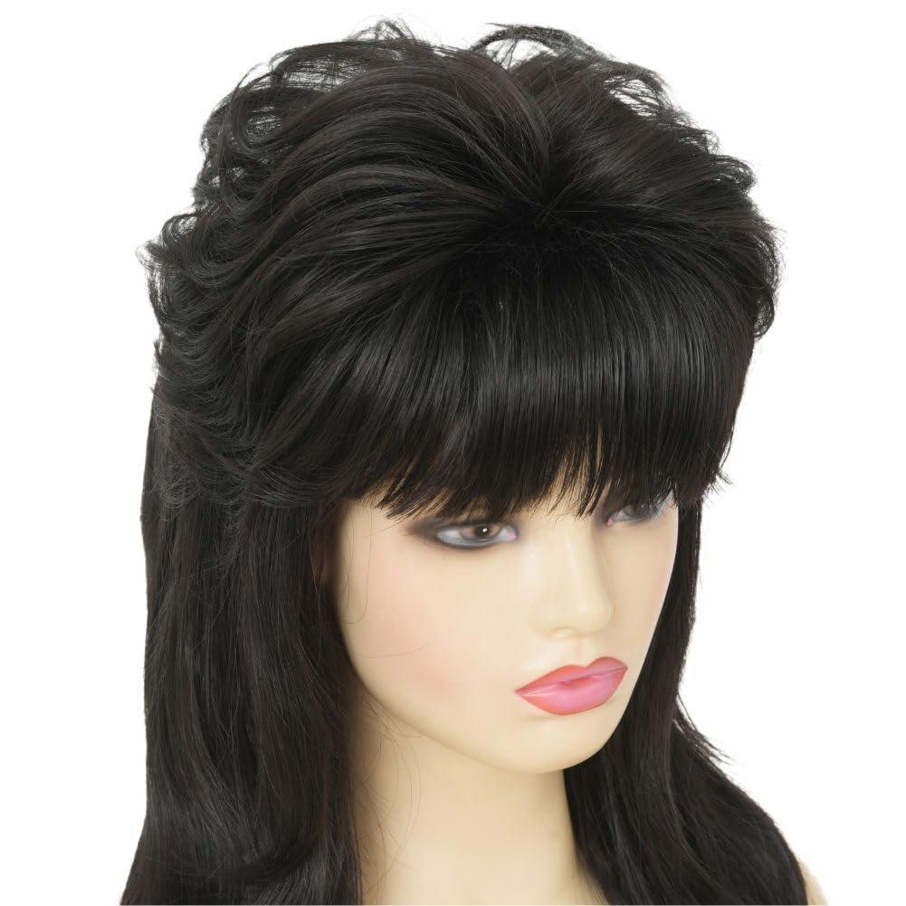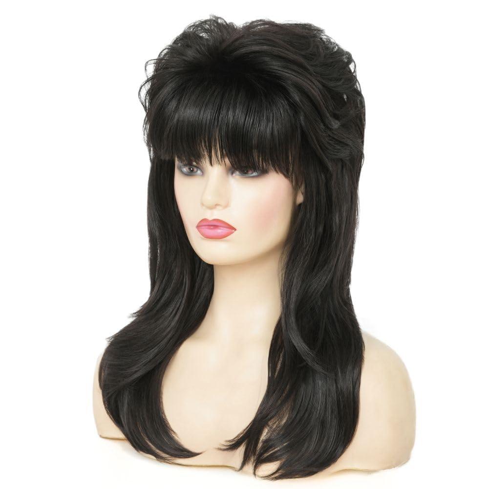Black 80s Long Wig for Women Mullet Wigs Layered Funny Wig with Bangs Natural fluffy Synthetic Wigs for Halloween Daily Party Use(Black)