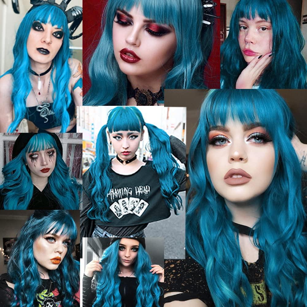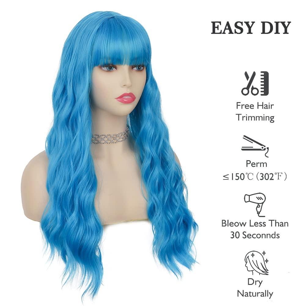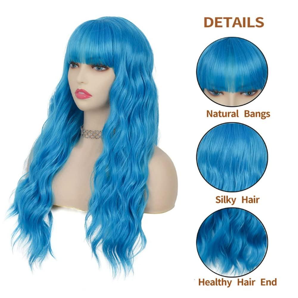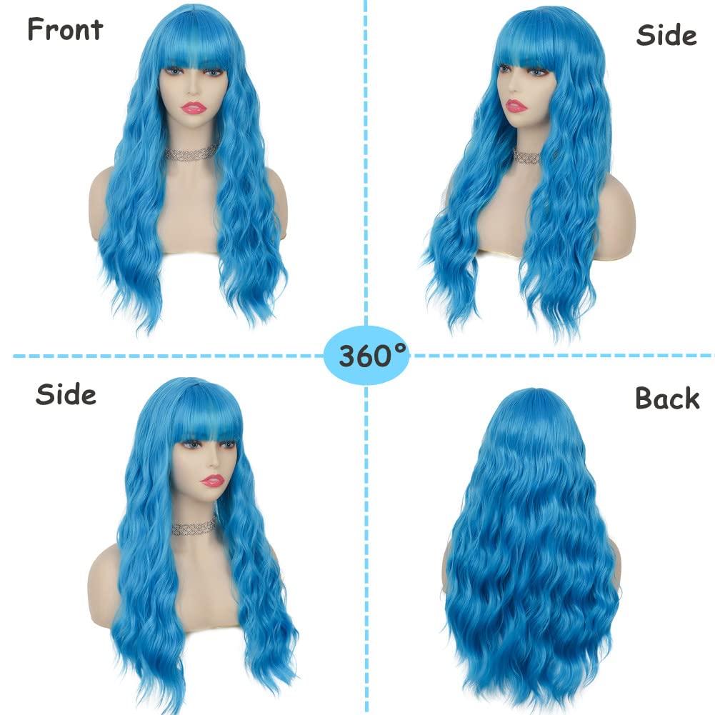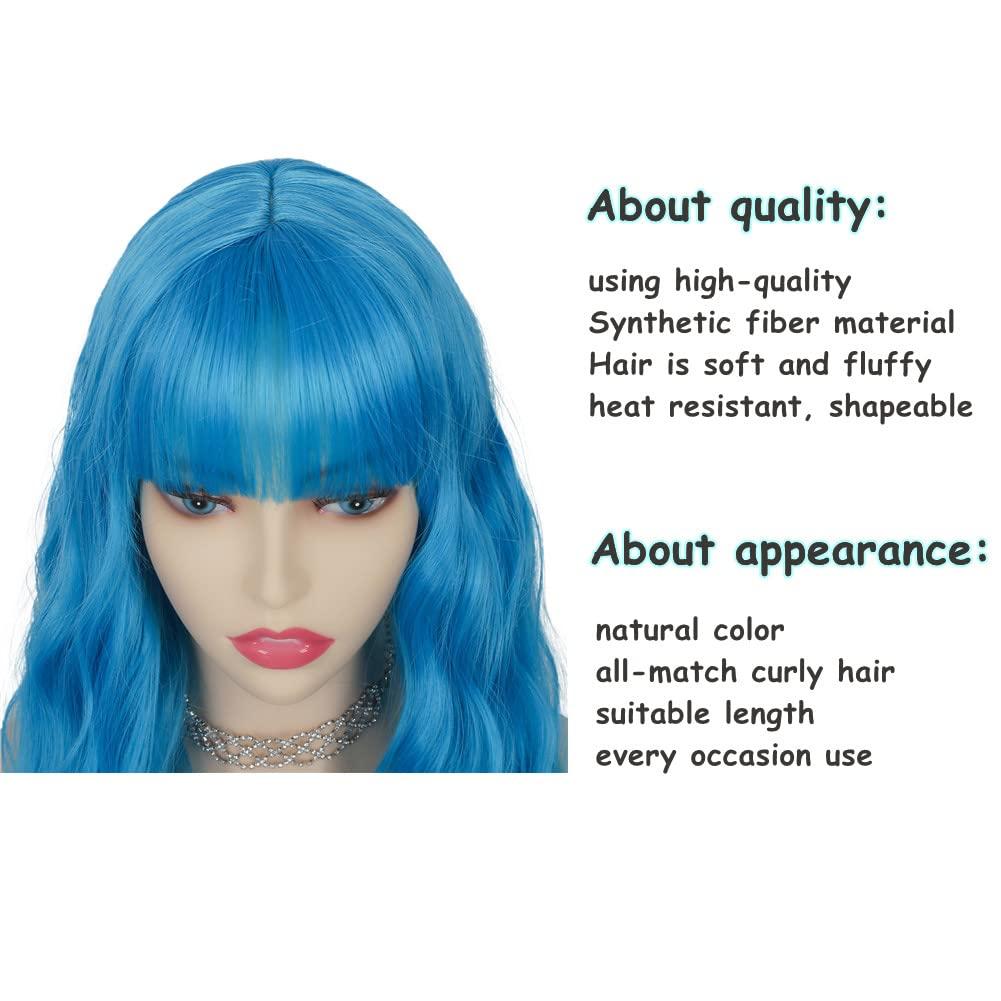 Blue Curly Wig with Bangs Long Women Wigs Wavy Blue Heat Resistant Synthetic Wigs for Women Daily Party Cosplay Halloween Use(Dark Blue)(Blue)