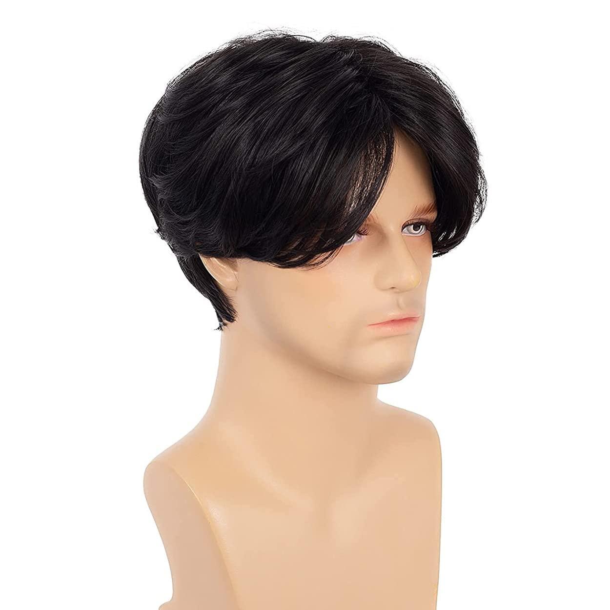 Brown Men Wigs Short Layered Straight Middle Part Fluffy Hair for Male Guy Synthetic Daily Cosplay Wigs with Cap(Brown)(Black)