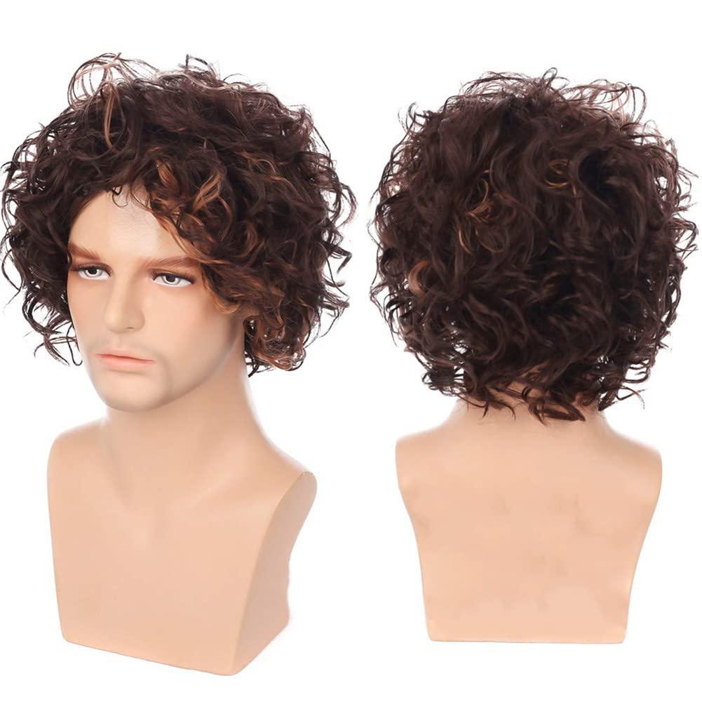 Curly Men Wig Short Brown Fluffy Layered Natural Looking Halloween Synthetic Wigs with Wig Cap