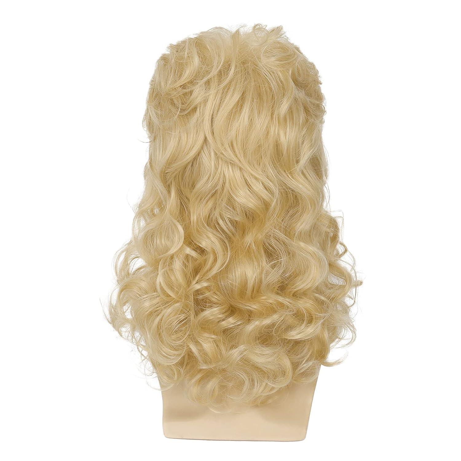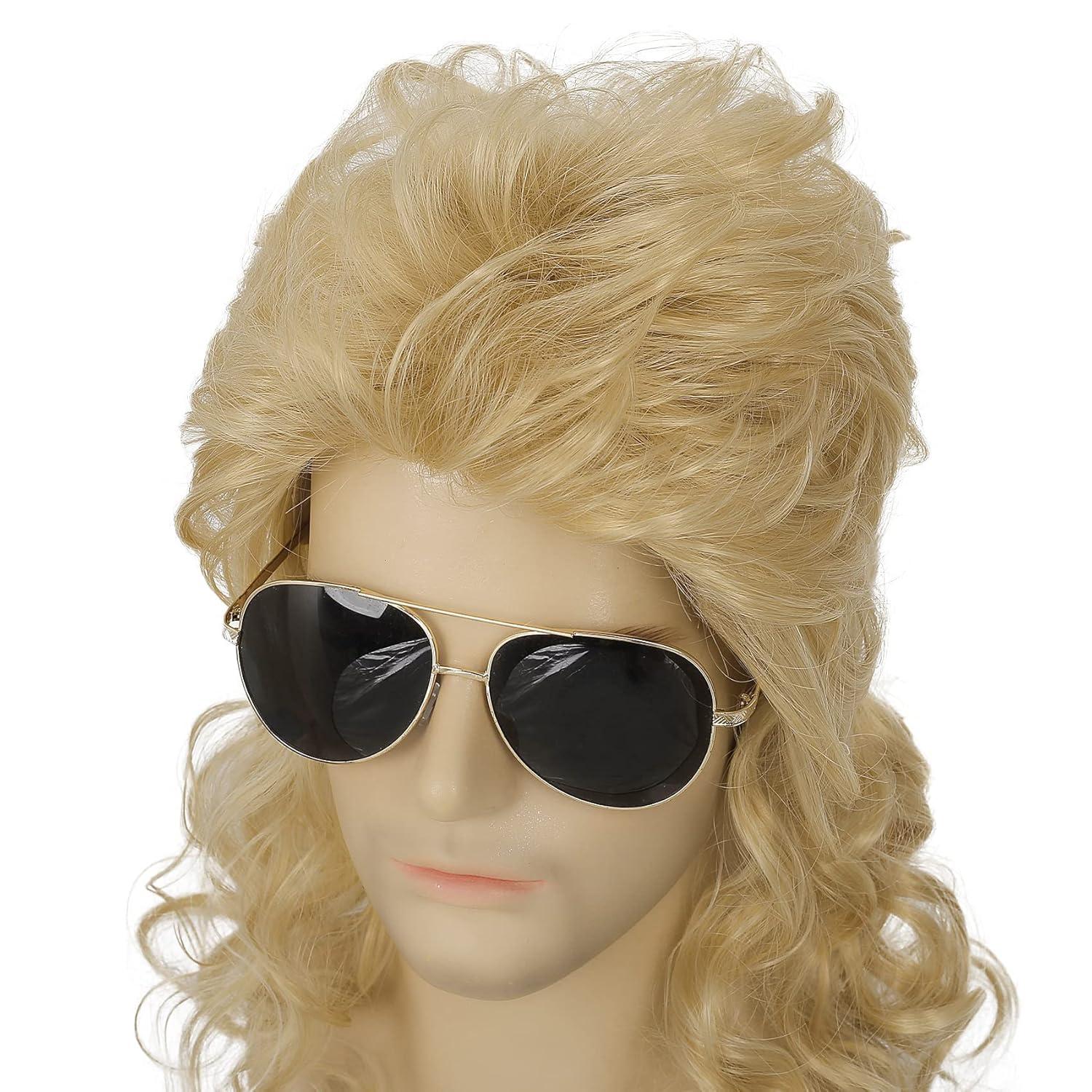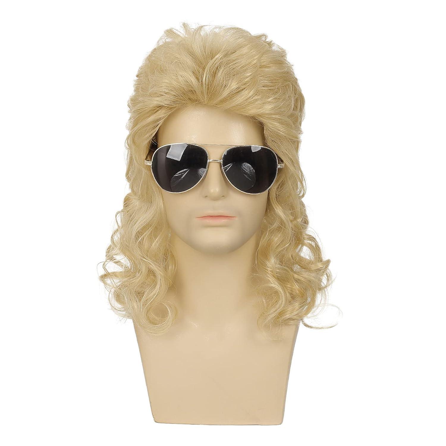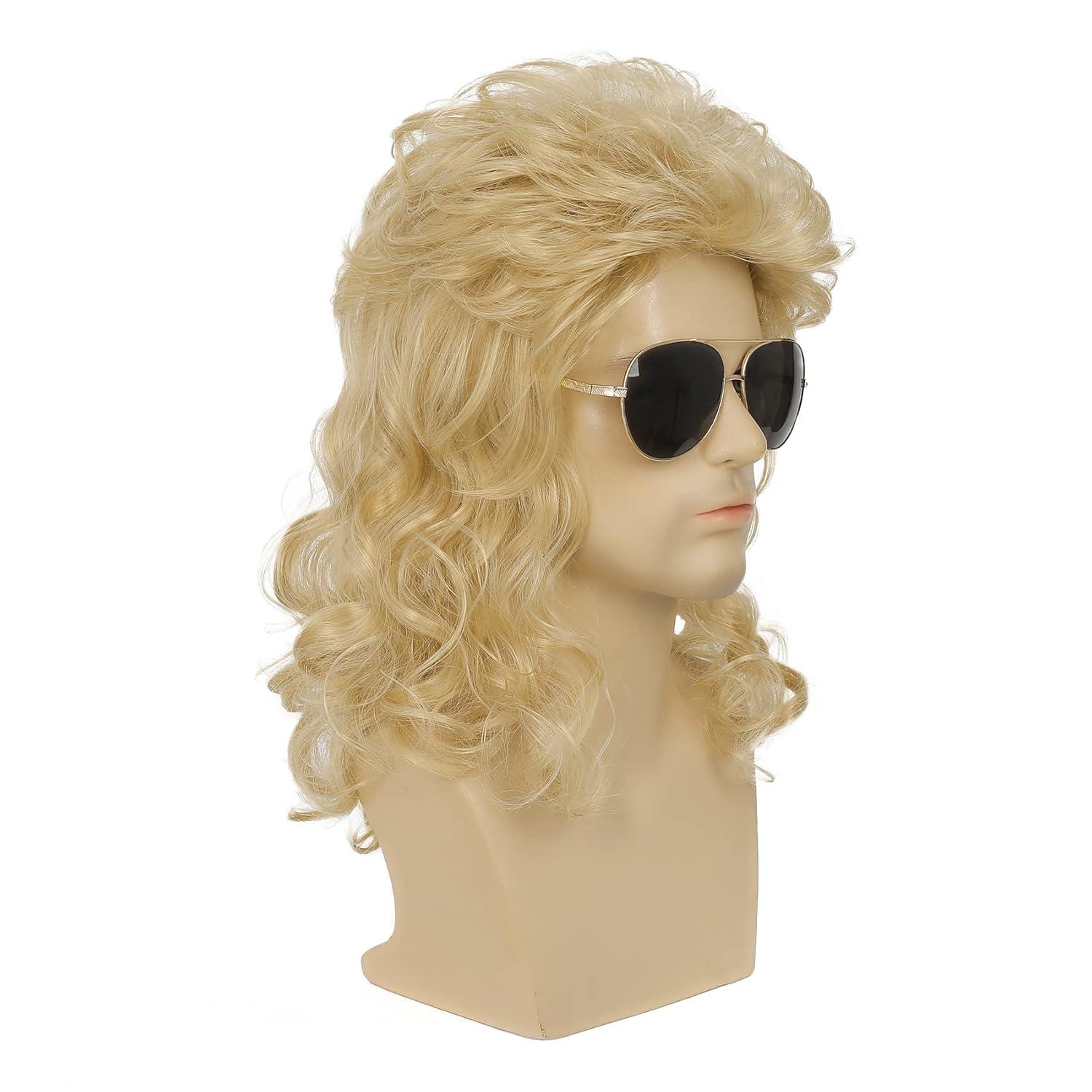 Mens White Long Curly Wig 70s 80s Rocker Wig with Bangs Synthetic Heat Resistant Halloween Cosplay Costume Wig(Blonde)