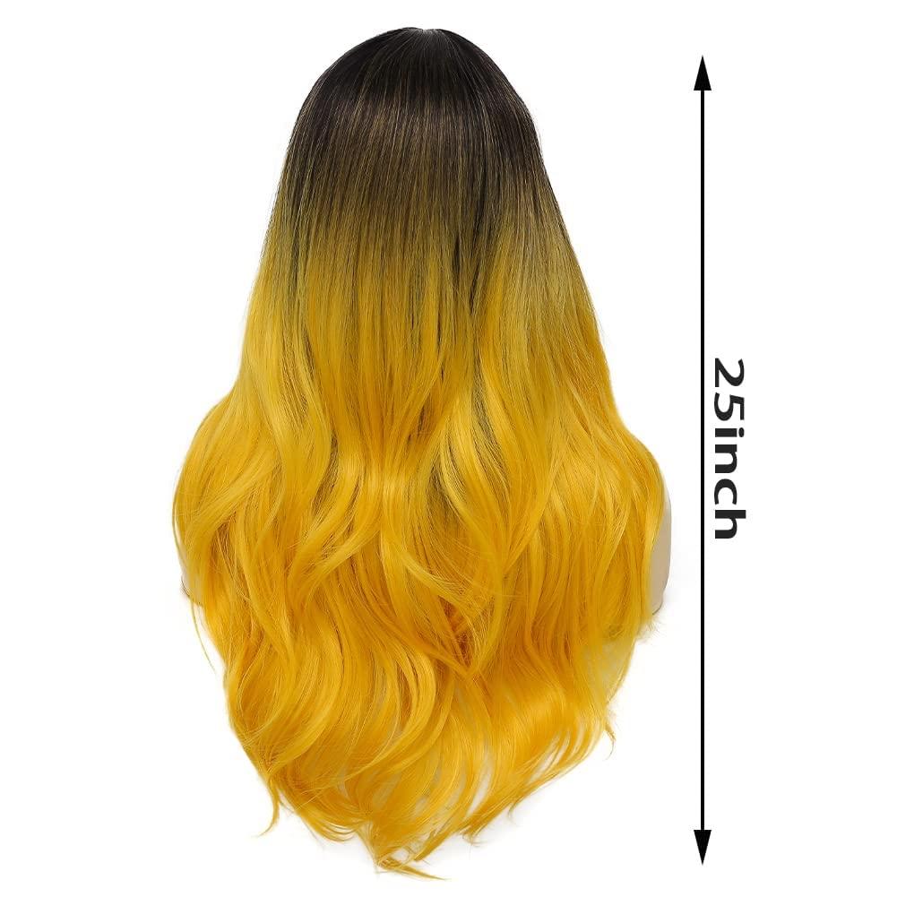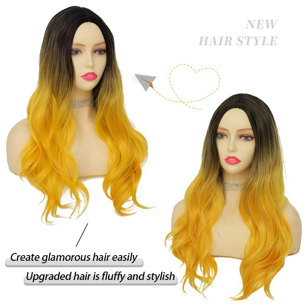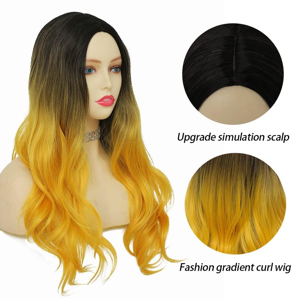 Ombre Purple Curly Wigs for Women Long Curly Wave Middle Part Synthetic Wig for Halloween Costume Wig(Grey ombre purple)(Yellow)