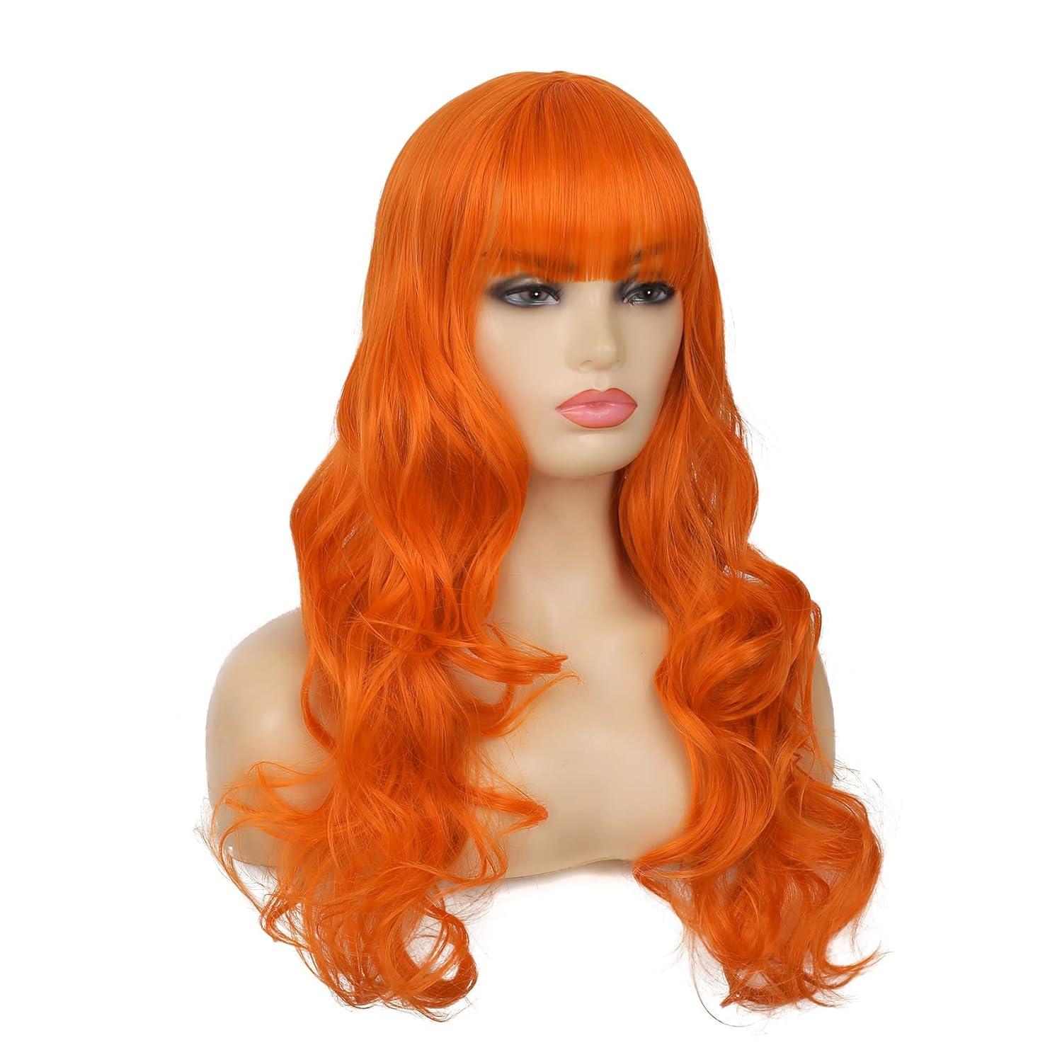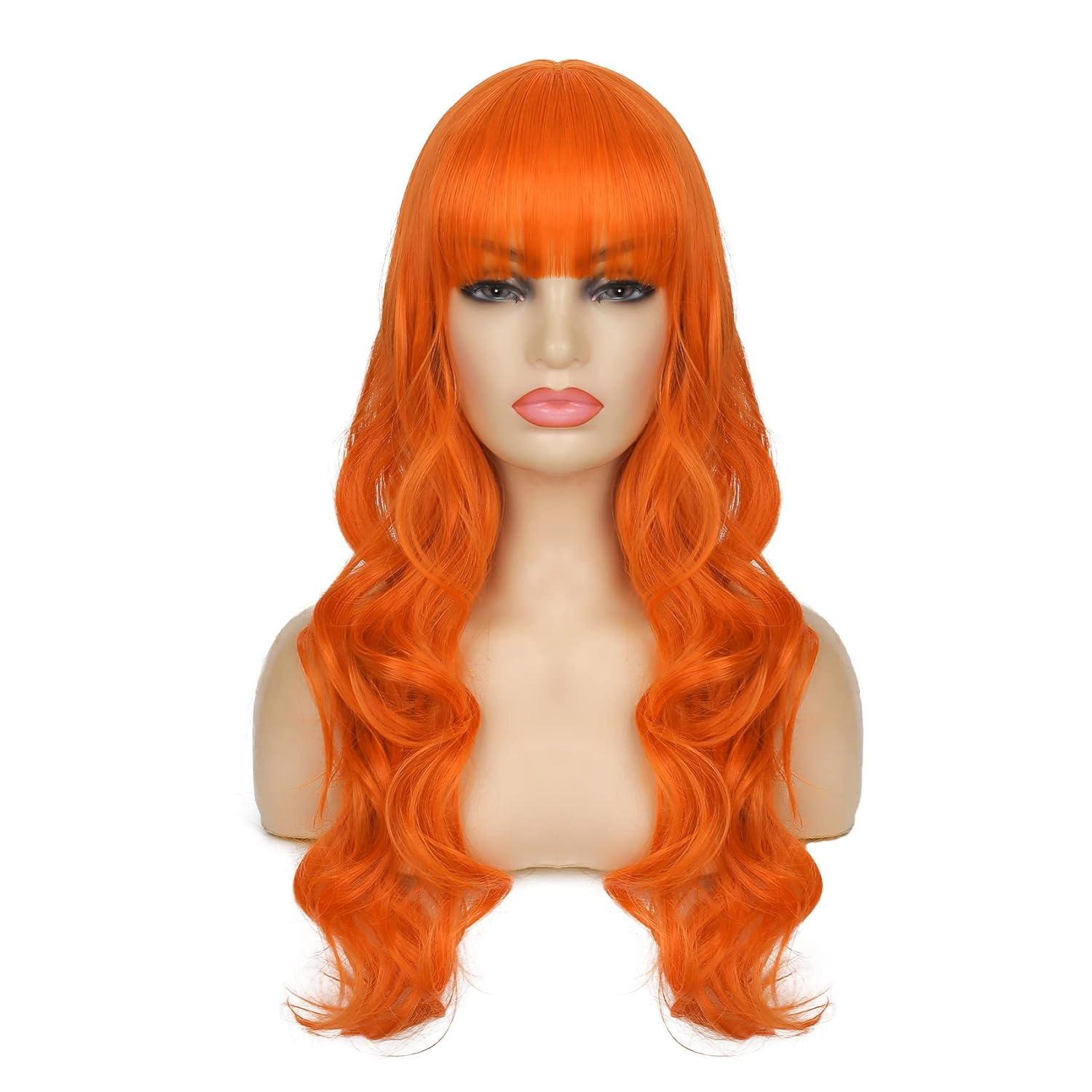 Orange Wig with Bangs for Women Long Curly Wavy Heat Resistantant Silky Ginger Wigs Cosplay Halloween Daily Use (Orange)(Orange)