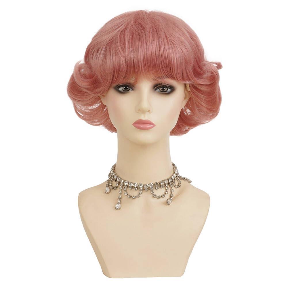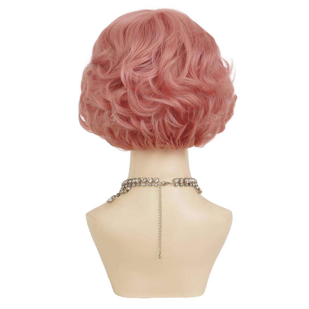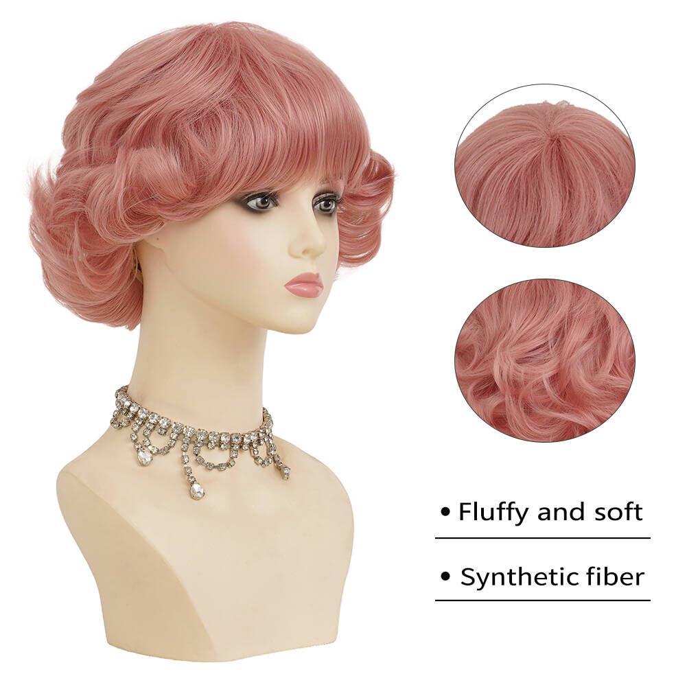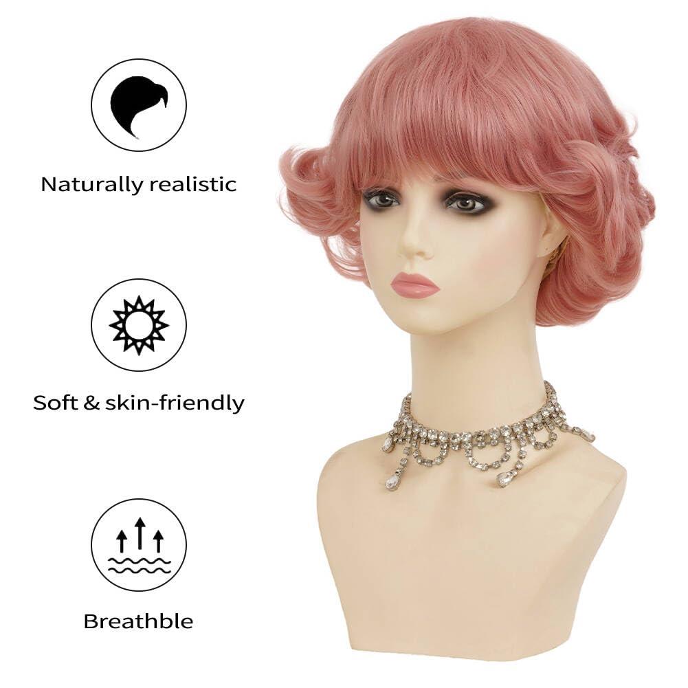 Short Pink Wig with Bangs for Women Bob Curly Wavy Wigs Synthetic Fiber Hair Wigs for Cosplay Halloween Daily Party Use