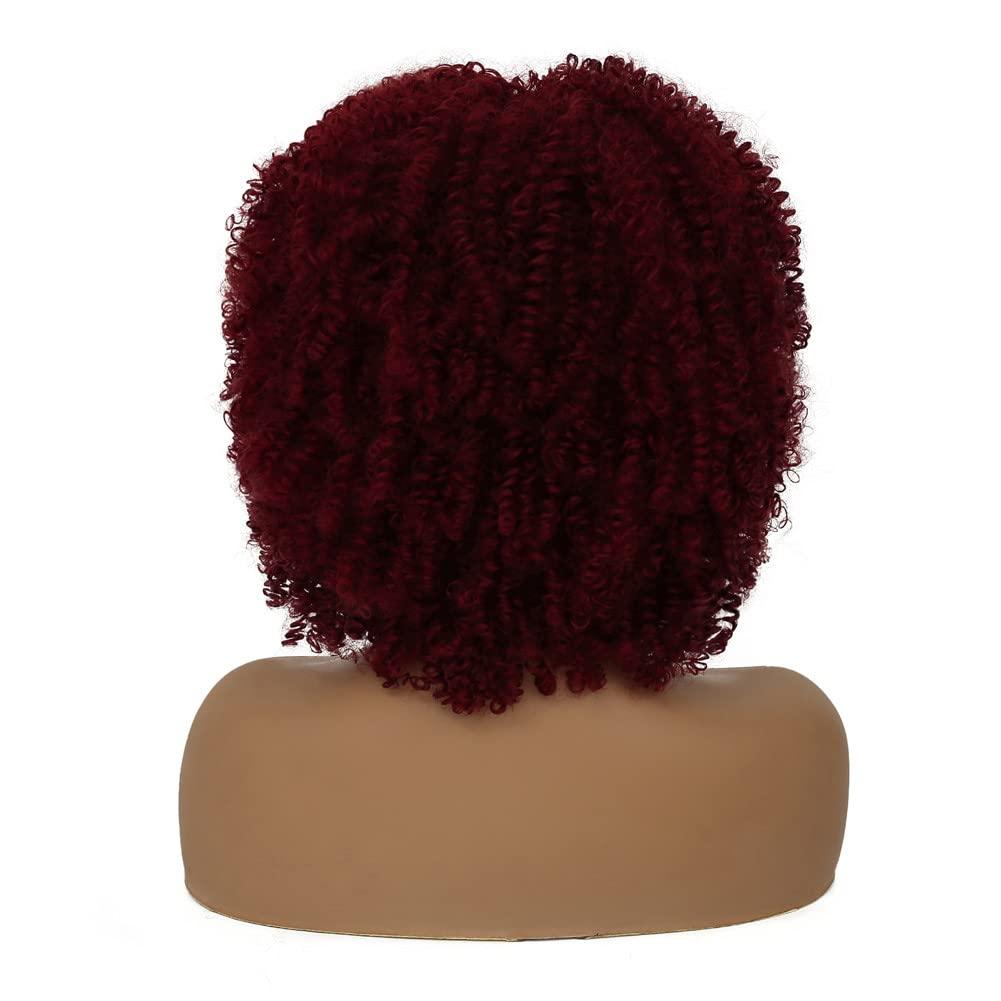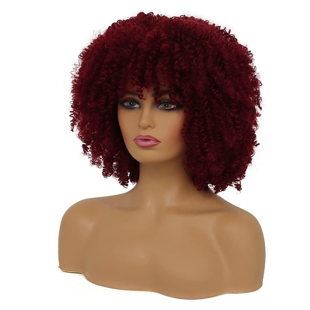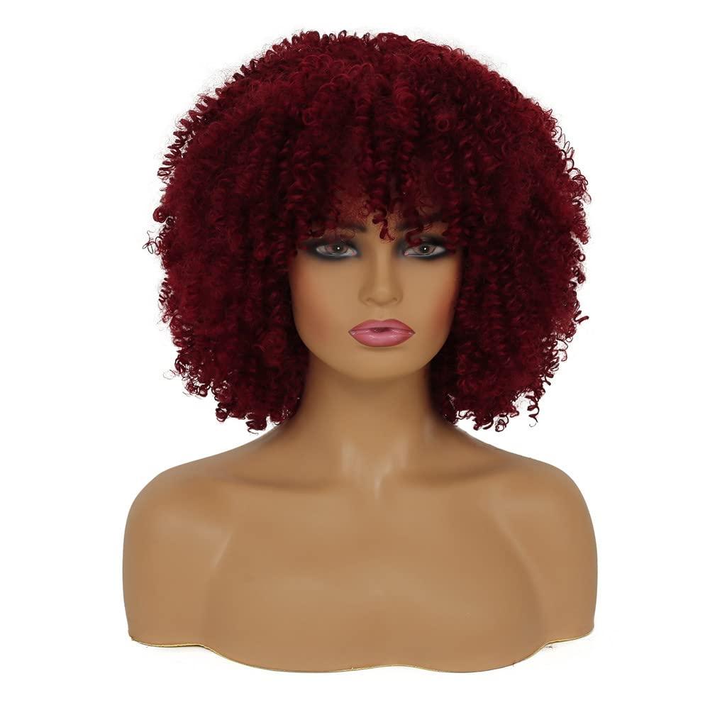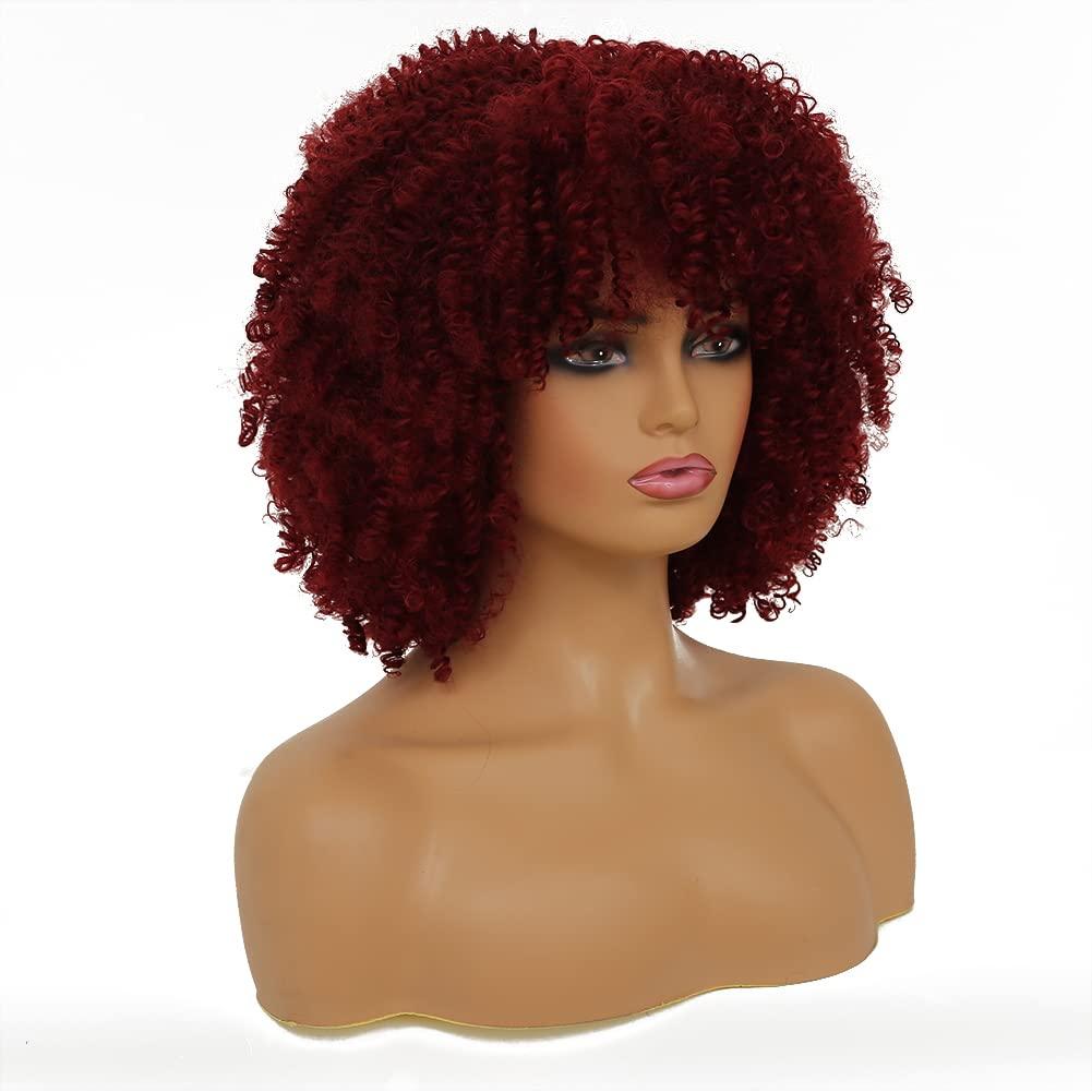 Short Wine Red Curly with Bangs Afro Fluffy Wigs for Black Women Natural Looking Synthetic Heat Resistant Kinky Wig for Daily Party Halloween Cosplay Use(Wine Red)