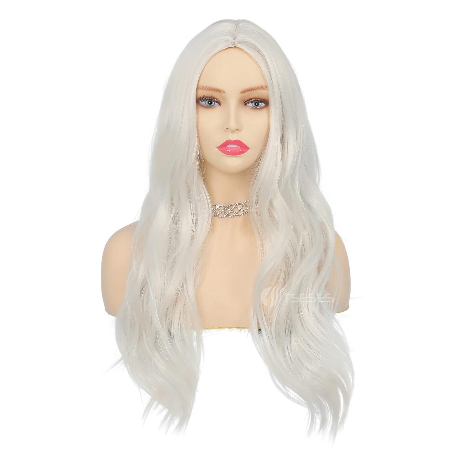 White Curly Long Wigs for Women Wavy Middle Part Natural Looking Heat Resistant Wigs Daily Use Halloween Party Hair(27.5 inch